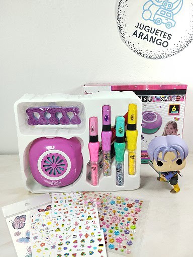 Además, incluye múltiples herramientas y accesorios que hacen la experiencia más completa. Entre ellos se encuentran marcadores especiales para uñas, decoraciones, separador de dedos y una mini secadora, lo que facilita el proceso de diseño y secado. Gracias a estos elementos, las niñas pueden personalizar sus uñas con colores, dibujos y detalles brillantes.